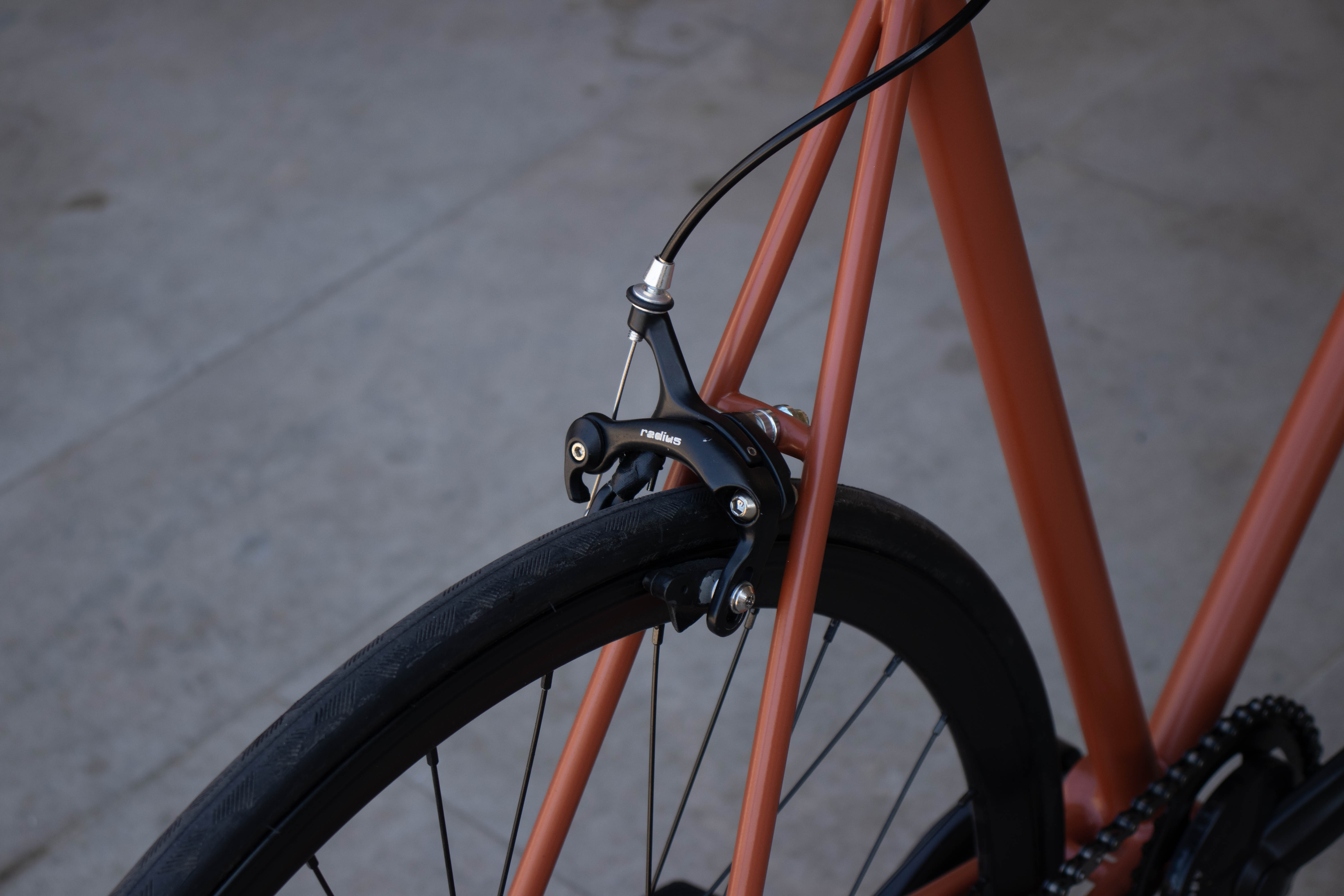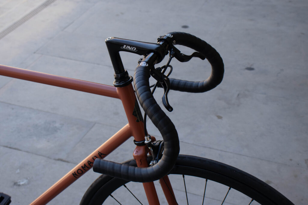 Vamos a detalhes e especificidades: o quadro e a forqueta eram de aço, material que tanto gostamos de trabalhar. Os travões escolhidos foram uns Radius, de pinça de pivot duplo, que conjugaram com umas manetes da Brick Lane Bikes, BLB 25,4 mm. Na frente desta bicicleta também podias encontrar um guiador Satori Fixter 25,4mm, 400mm de largura, um avanço da Uno 25,4mm, 1″ e, claro, uma fita de guiador da Bike Ribbon Professional.