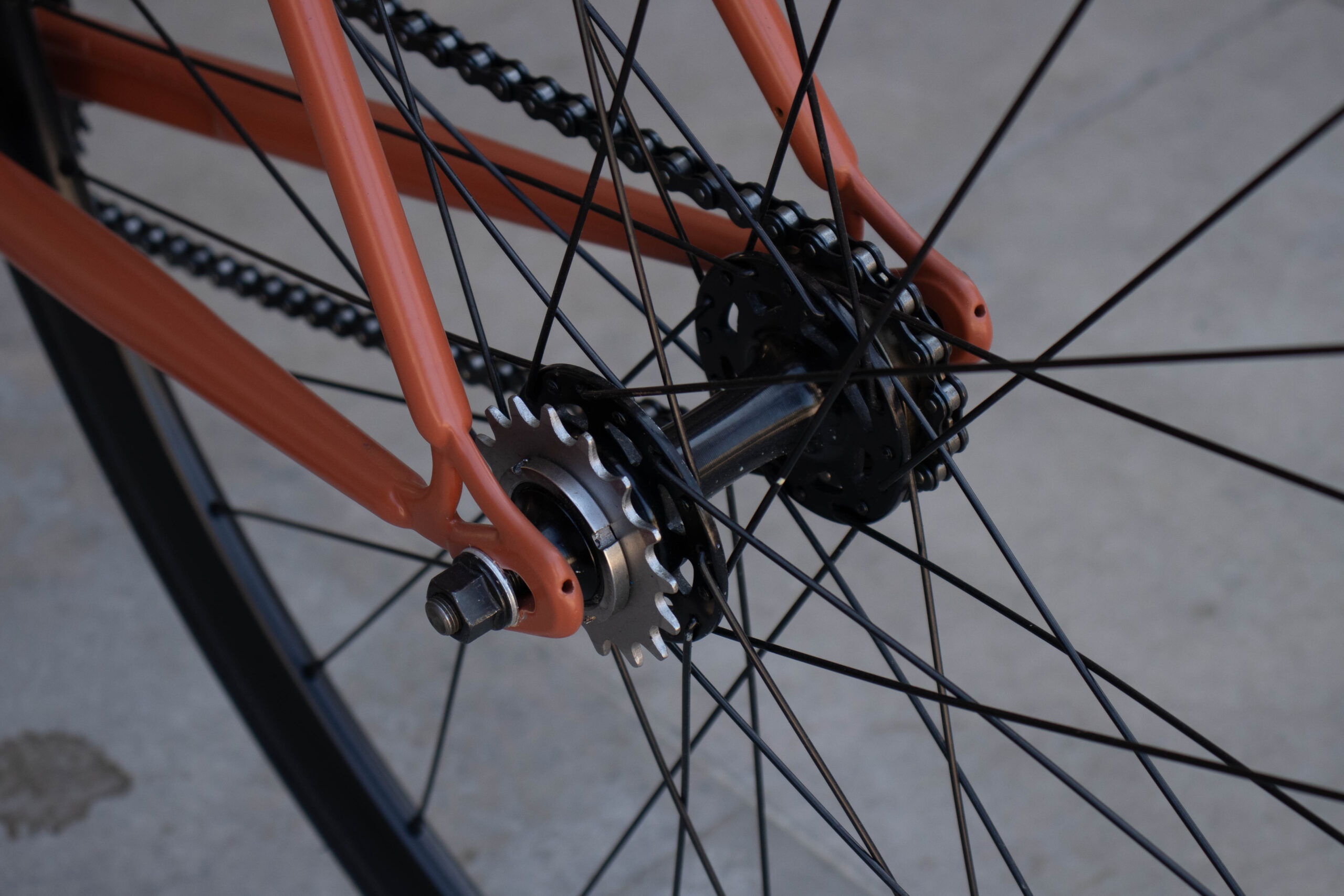 Vamos descer um pouco, em direção à transmissão. Sendo uma bicicleta single speed, é evidente que só tinha 1v. Escolhemos um pinhão de 16 dentes, que refletia a experiência que queríamos proporcionar com esta bike. A pedaleira era uma Miranda, de 38 dentes. Já a corrente é uma KMC B1 112l, marca que certamente reconheces.