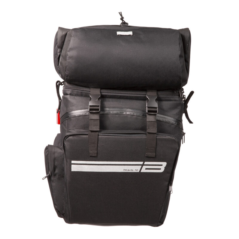 É composta por duas bolsas laterais de grande capacidade e uma mochila central que podes remover facilmente e usar de forma independente. Ideal para quando deixas a bicicleta e segues a pé.